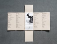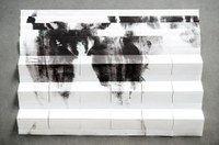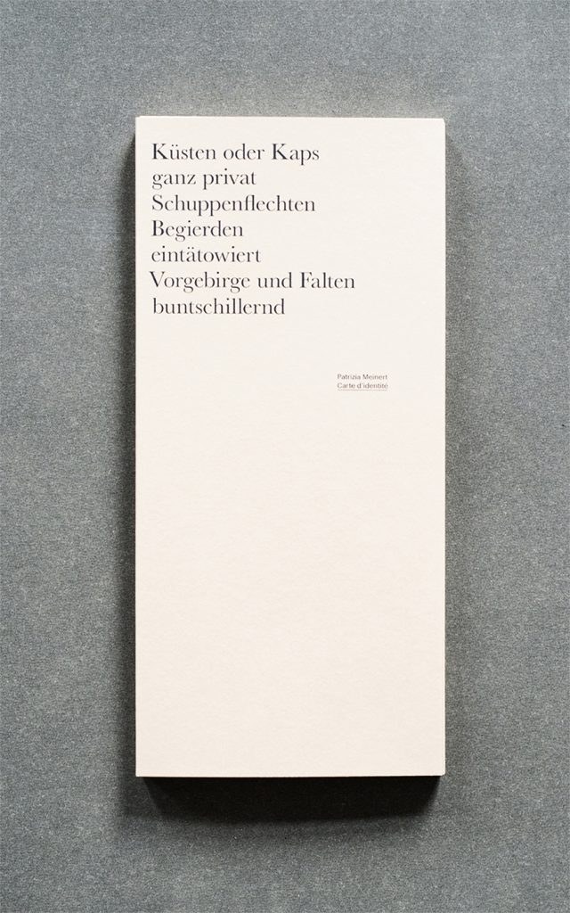 Kunstenaarsboek van Patrizia Meinert, winnaar van de MCBA Prize 2017 (International Artists Book Prize). - The cover of the folder showing the title: carte d’identité and a selection of five words taken from the list inside (saying: coasts and capes, entirely private, psoriases, desires, tattooed, promontories and folds, variegated.). The folder fully opened: The entire list of words plus coordinates can be seen at a glance. The center of the folder houses the map. The map fully unfolded horizontally (it corresponds to the circumference of the body). The coordinate system shows up completely (The numbers are placed at the bottom, the lettersat the left margin). At this point the viewer is invited to start connecting the words with the areas of the map by means of the coordinates. The structure of the map allows to browse through it’s single sections and to approach the desired areas without unfolding it.But, of course, the map can also be unfolded entirely to expose the whole body print. - “The skin is a variety of contingency: in it, through it, with it, the world and my body touch each other, the feeling and the felt, it defines their common edge. Contingency meanscommon tangency: in it the world and the body intersect and caress each other.” Carte d’identité reveals the intimate topography of the body’s surface. Each copy is a one of a kind body print on Kozo paper — elaborately folded into a map. The body of the book has become a vital subject of my artistic approach. It developed from my research on time in books. While I was working on a set of artist’s books focussing on time and movement (inspired by Henry Bergson’s philosophy of time) I became aware that the body and the physical presence of the book remained a basic and fundamental condition — even though I stubbornly intended to specifically emphasize the temporal aspect. This experience helped me to gain a deeper understanding of the physical dimensions of book structures and the way they influence the reader’s perception. And it was the starting point of this project which eventually led to the idea of using my ownbody as a print form. When I came across Michel Serres’ The Five Senses: A Philosophy of Mingled Bodies I new it had to be a map. According to Serres our skin is like a landscape which bears the tracesof what we experience in our lives. He describes this idea using poetic comparisons and paraphrases. I collected the words that seemed substantial to me and put them in an alphabetical order. After printing the body map I started to connect the different zones ofmy body with these words by setting up a coordinate system. This intimate and subjective examination as well as the immediacy caused by the direct contact of skin and paper makes the Carte d’identité a very personal work.