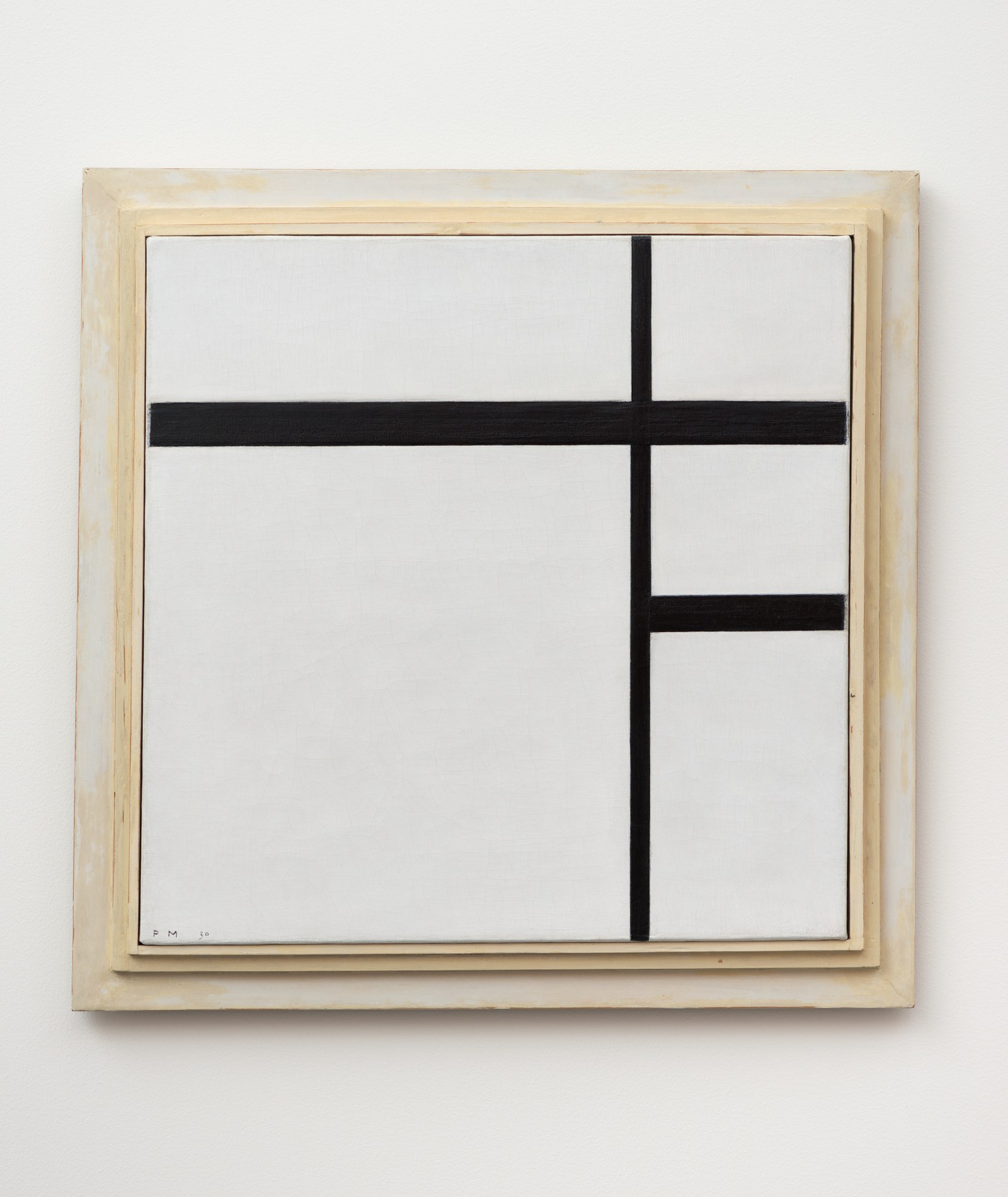 'Composition No. II' is one of Mondrian’s most austere works. Using only white and black and with no more than three lines, he constructed an asymmetrical but balanced image. As the lines, and therefore also the planes, vary in length and width and this variation was not achieved systematically but intuitively, it is still a lively painting despite the austerity. In 1911 Mondrian saw some of the Cubist paintings of Picasso and Braque at an exhibition in Amsterdam. He was struck by their attention to shape and the possibility of representing shapes from reality as more or less independent abstract forms. Mondrian was in Paris from 1912 to 1914, where his work was greatly influenced by Cubism. When he returned to the Netherlands his work became gradually more abstract until he completely liberated himself from realistic representation in 1917.