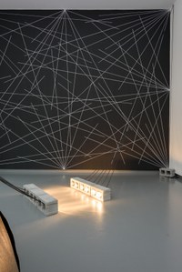 Two elements of three blocks of shotcrete (sprayed concrete) placed together are arranged in parallel lines. The concrete blocks each have two square openings in which there are lamps. The lamps in the two elements shine towards each other. The wires of the six lamps for each element run up on the outside of the work and join together in one cable which disappears into the ceiling. 'Luci', which means “lights”, is exhibited in a dark space. With regard to this work, Zorio said: “My work with the lamps which is placed on the floor developed from the idea of giving light its real function back, which is not that of illuminating a table or a room, but as a source of heat and energy. Here we see light being confronted with more light. I thought of this work as light competing with the sun.”