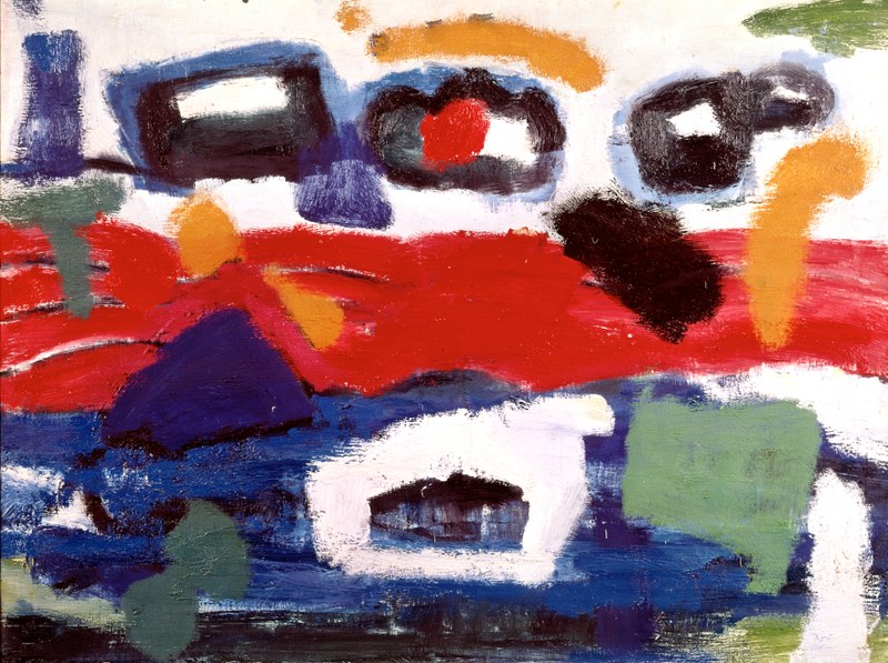 Without looking at the title it is easy to see this painting as a completely abstract canvas. The work is dominated by open, yellow circular forms which have in most cases been placed over a red circle. In the middle of these, Banner painted smaller circles or marks with one or more contrasting colours. Sometimes he used red for the last layer. The rest of the canvas is covered with strokes of paint mainly in blue shades, alternating with white, black, yellow, green and red. The paint was applied as a dry and paste-like substance. Upon reading the title, 'Red and Yellow Flowers', this figurative starting point becomes identifiable. Benner worked in an expressionist style, usually using bright contrasting colours which he chose intuitively, rather than on the basis of a realistic starting point. He used coarse brushes and applied the paint thickly, fairly dry, in layers. Benner’s work reflected the love which he felt for his subjects: for his environment, living creatures, and nature. He referred to “the wonder of the world”. His loving admiration for everything he encountered was the real theme of his work.