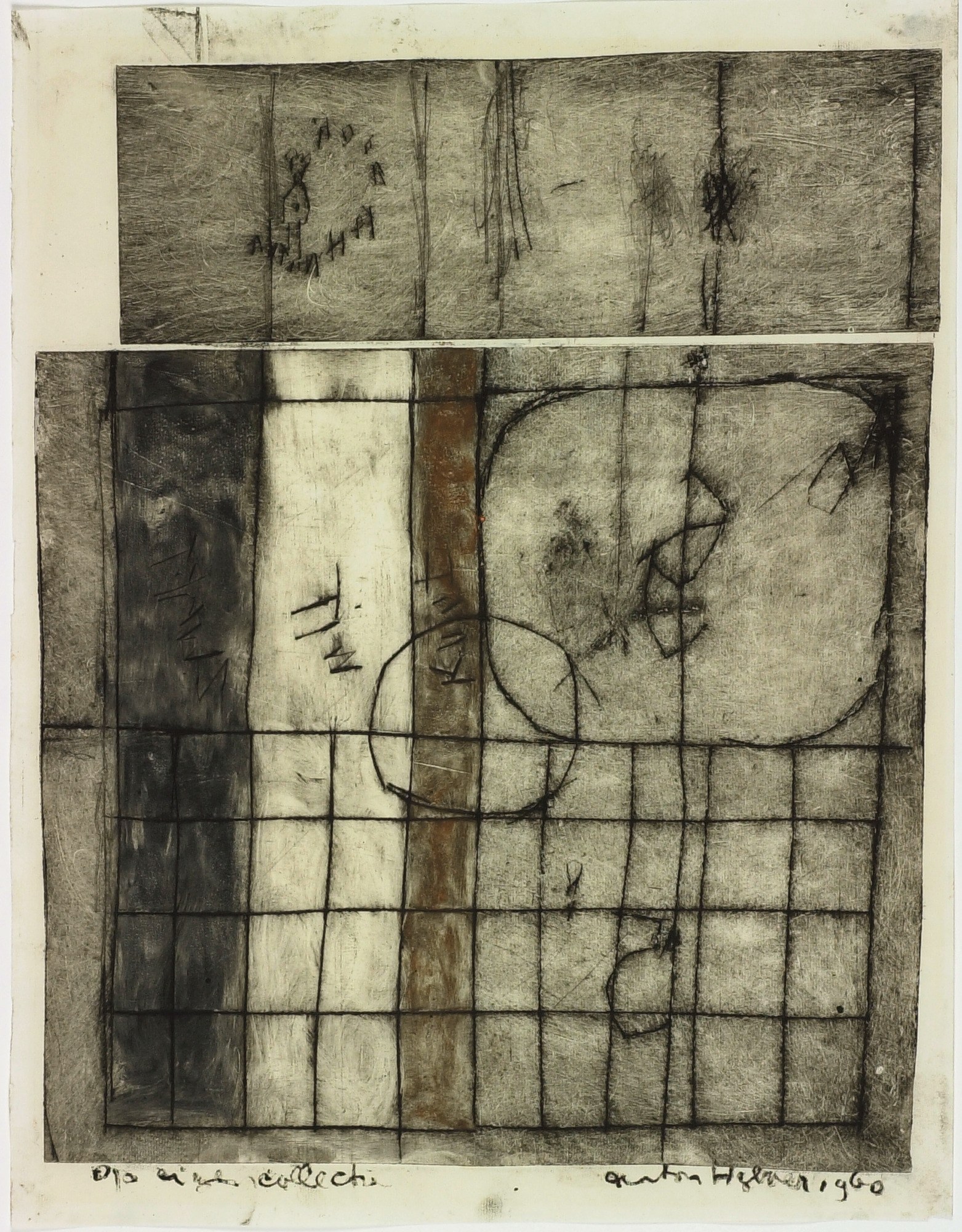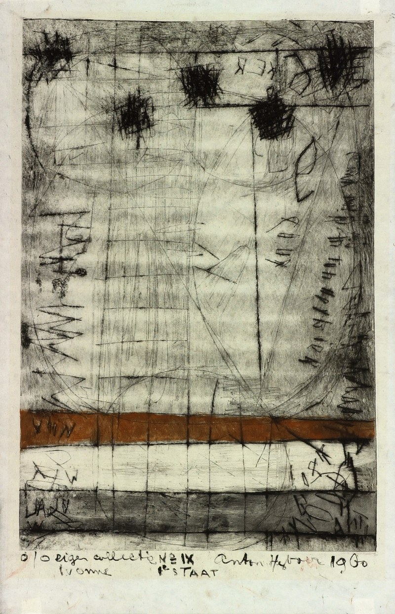 This engraving by the Dutch artist Anton Heyboer was made with the use of two separate zinc plates which were printed one below the other with a small space in between. The four elements from the title can be seen in the lower print. Crisscrossing lines form a pattern of diamonds. On the left there are three coloured bars: black, white and a brownish red. In the middle there is a circle. The top right corner contains a square shape with rounded corners which could be seen as a face, also because of the marks which have been scratched into it. The top print joins the lower print on the right side. On the left side, it is slightly indented. Various vertical lines from the bottom plate continue onto the top plate. In addition to the above-mentioned elements, both plates contain a number of inscriptions that are like drawings. The engraving was made in very roughly polished zinc and countless scratches are visible in the background.