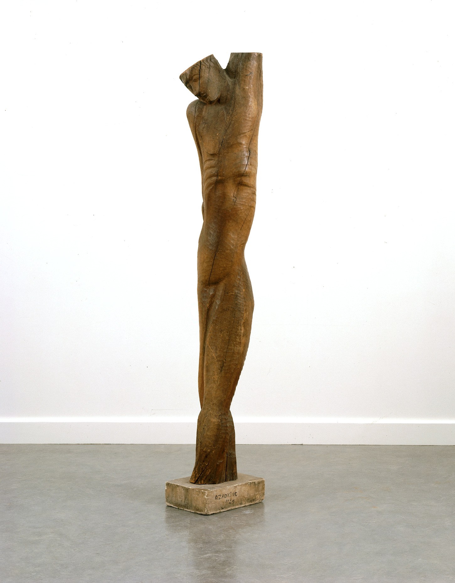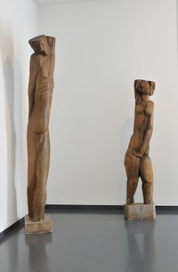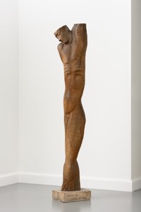 This wooden statue by Zadkine represents the body of a man. He is stretched out with a slight rotating movement from the ankles up to the raised left arm which has been cut off. The head is bent and hangs down onto the right shoulder. Zadkine's statue follows the natural form of the tree trunk. Only very little material was removed to create 'Saint Sébastien'. Zadkine used the branches at the top of the tree trunk to distinguish the head and the arm. The statue does not have any feet, and in addition to the left arm, Saint Sébastien's head has also been cut flat. The ribs and elbow of the right arm are represented by sharp grooves. The other lines of the statue are more flowing. The traces of the gouging process are clearly visible on the skin of the statue.