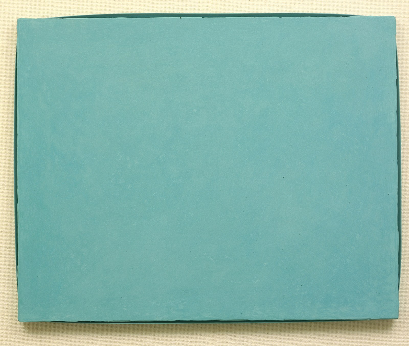 This painting by Spalletti consists of a thick layer of plaster paint applied to a panel. The mass of paint has set and protrudes slightly over the edges. A strip of card has been attached around the sides of the panel. At the corners, this fits tightly onto the work, but towards the centre there is some space between the strip and the panel. The whole work is painted a soft bluish-green colour. At the front of the panel the layer of paint has been sanded smooth.