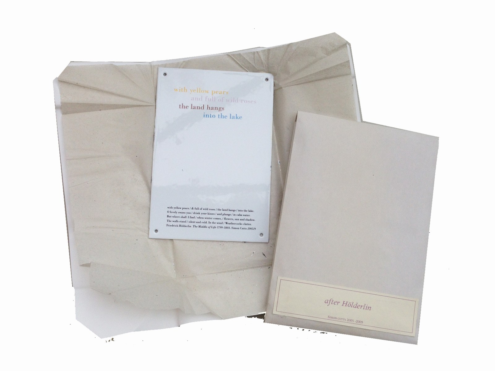 Kunstwerk dat bestaat uit een enveloppe met daarin een emaille plaquette waarop in drie primaire kleuren een tekst van Friedrich Hölderlin uit The Middle of Life, 1799-1803 is gedrukt