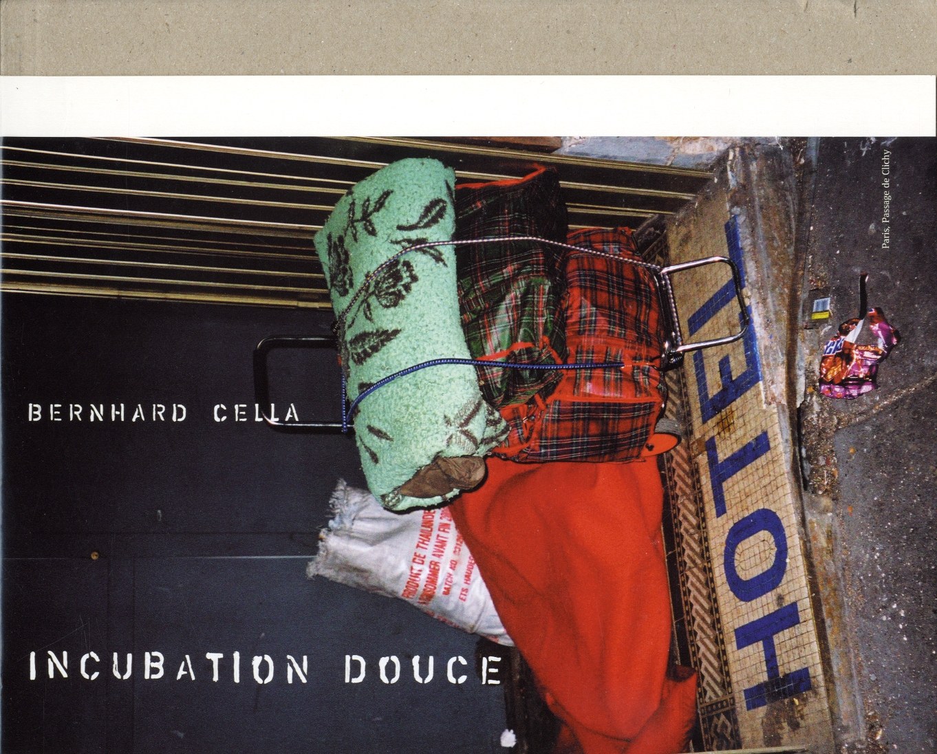 Gedrukt op bruin gerecycled papier confronteert Berhard Cella met Incubation Douce de verwachtingen en opvattingen van een middle-class reiziger met de harde werkelijkheid van de dakloze. Door gekleurde foto's van de tijdelijke behuizingen uit karton tegenover de enquêtes uit hotels in Engels, Frans, Duits en Russisch te stellen wordt de wrange werkelijkheid visueel gemaakt