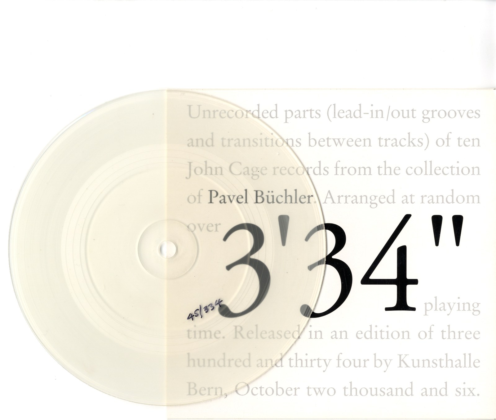 Kunstenaarsuitgave, in de vorm van een 45-toeren grammofoonplaat, naar een concept van Pavel Büchler (Tsjechië 1952). De opname bestaat uit een registratie van de aanloop- en uitloopgroeven van tien plaatopnamen van John Cage