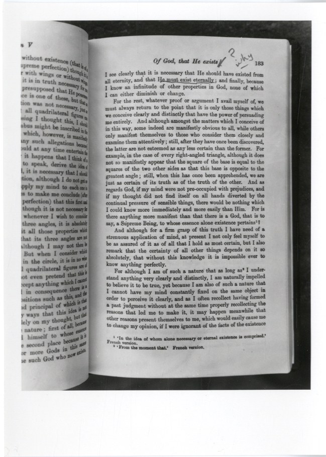 Kunstenaarsuitgave bestaande uit vijf zwart-wit foto's van filosofieboeken met opengeslagen pagina's waarop aantekeningen zijn gemaakt. De boeken zijn afkomstig uit de Hunt Library, Carnegie Mellon University Pittsburgh en geschreven door resp. René Descartes, Ludwig Wittgenstein, John Lock, Walter Stace en Karl Marx
