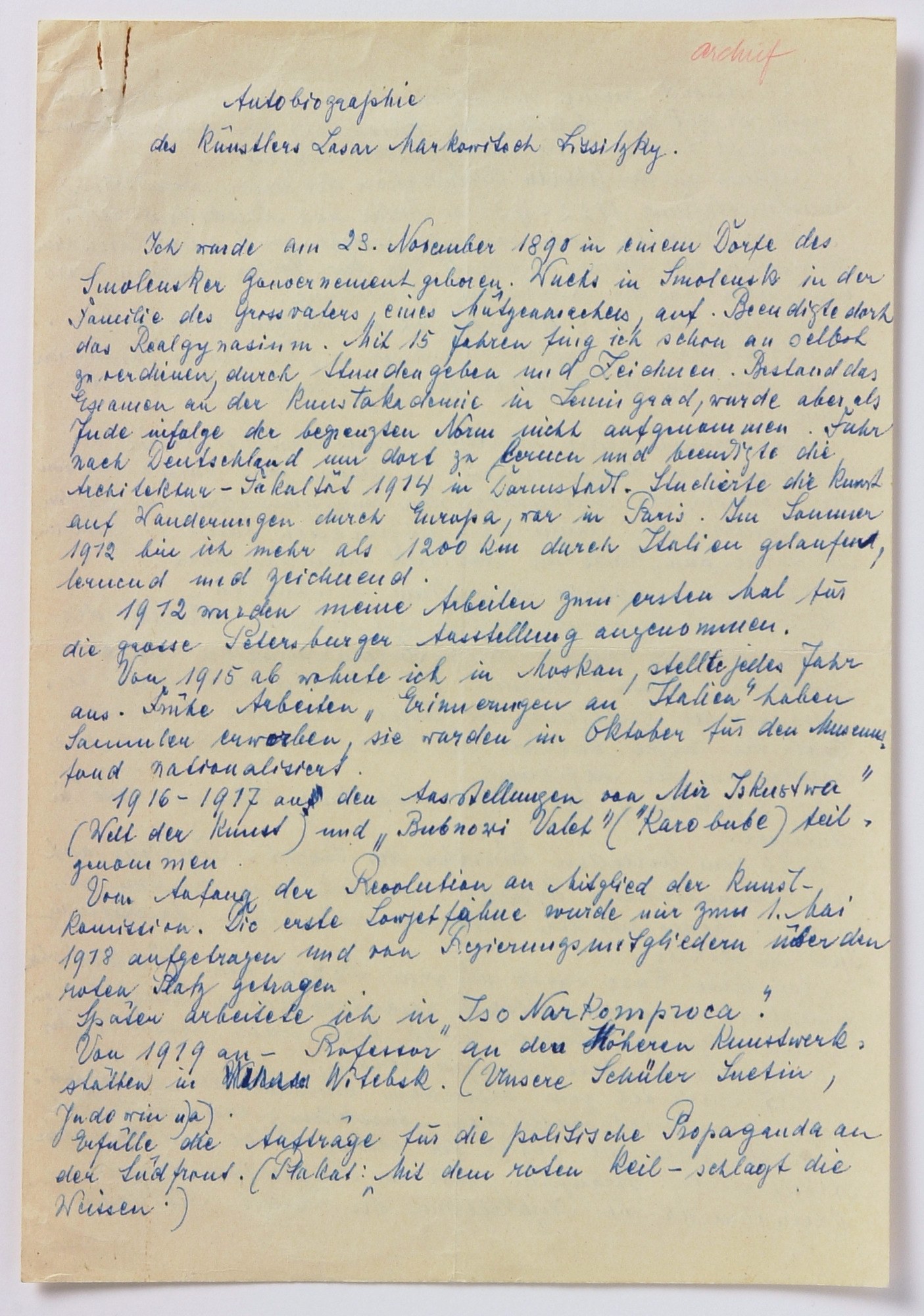 Duitse vertaling van manuscript 'Autobiographie des Künstlers Lasar Markowitsch Lissitzky' door Sophie Küppers-Lissitzky