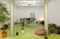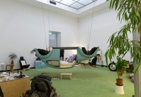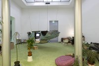 De lichtblauwe Volkswagen die in deze ruimte opgehangen is, trekt meteen de aandacht. Het is een kunstwerk van de Thaise kunstenaar Surasi Kusolwong en het heet Naked Machine (Volkswagen Modern). De wielen, de motor, het stuur en het interieur, alles is van deze auto afgehaald. Alleen de carrosserie is over. En deze hangt op zijn kop, stevig bevestigd aan het plafond met staaldraad. De twee deuren zijn er uitgehaald zodat je er gemakkelijk in kunt plaatsnemen. Om het verblijf in de auto wat aangenamer te maken zijn er comfortabele kussens in gelegd. De ramen zijn met gekleurde folie beplakt. In deze auto kun je liggen luieren of een video bekijken. Eigenlijk kun je er alles doen wat je niet kunt als je in een rijdende auto aan het stuur zit.