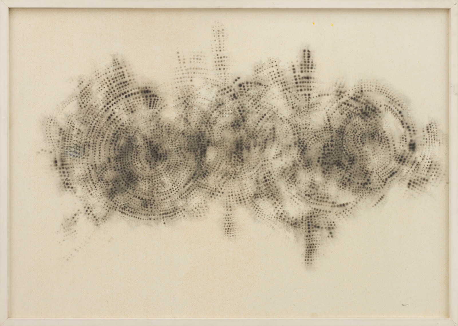 'Rauchzeichnung' van de Duitse kunstenaar Otto Piene bestaat uit papier en roet. Het werk is gemaakt met behulp van een metalen plaat, voorzien van gaatjes in een patroon van concentrische cirkels. Piene laat de rook van een kaars of een petroleumlamp door de gaatjes neerslaan. Zo worden puntjes gevormd variërend van diep zwart tot lichtgrijs. Hier en daar ontstaan vlekken doordat de rook onder de plaat doordringt. Het patroon van gedeeltelijk overlappende cirkels of cirkelfragmenten geeft het beeld dynamiek: de cirkels lijken in beweging.