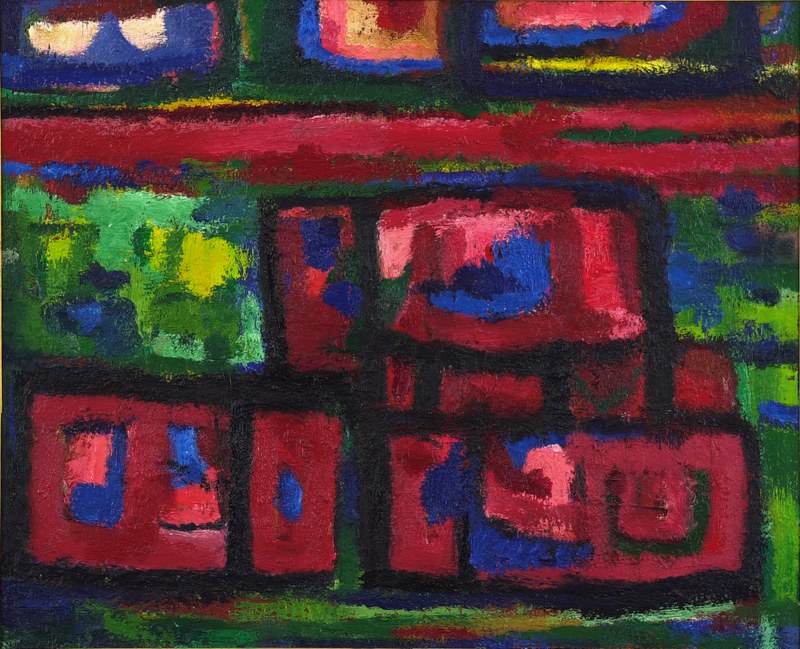 Zonder naar de titel te kijken, is dit schilderij gemakkelijk te beschouwen als een volkomen abstract doek. Het beeld wordt gedomineerd door gele open cirkelvormen, die in de meeste gevallen over een rode cirkel heen gezet zijn. In het midden daarvan schildert Benner met één of meer contrasterende kleuren kleinere cirkels of vlekken. Soms brengt hij het rood als laatste laag aan. De rest van het doek vult hij met toetsen verf in vooral blauwe tinten, afgewisseld met wit, zwart, geel, groen en rood. De verf is droog en pasteus opgebracht. Bij het lezen van de titel 'Rode en gele bloemen' wordt dit figuratieve uitgangspunt herkenbaar.