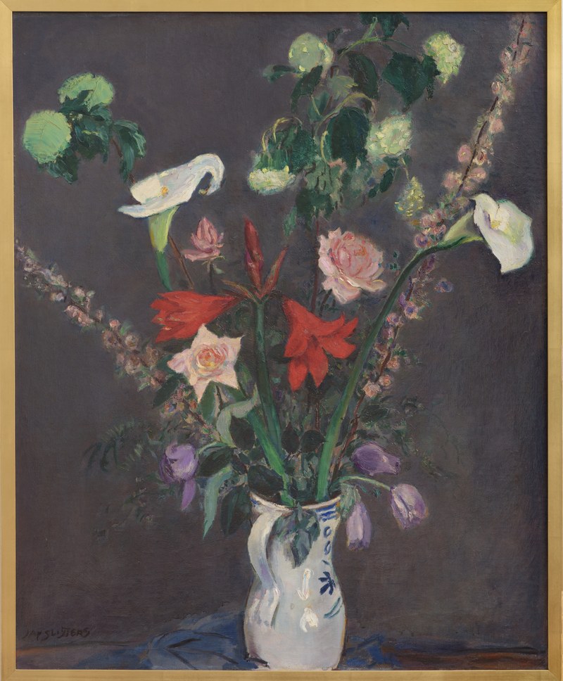 Na een periode van experimenteren met moderne stijlen, maakt Jan Sluijters in de jaren twintig van de 20ste eeuw ook schilderijen die traditioneler ogen. In dit 'Vrouwenportret' lichten de bleekgele jurk en de lichte huid van het model op tegen de donkere omgeving. Haar zwarte haar steekt nauwelijks af tegen de bruingrijze muur. De oorbellen en ring van de vrouw vormen felrode accenten. Bij langer kijken, ontdek je een donkerrood kussen links van de vrouw. Het donkergele kussen rechts, waarop haar arm leunt, heeft een toon die de lichte en donkere delen van het schilderij verbindt. De compositie van het schilderij is weloverwogen opgebouwd. Het lichaam van de licht achterover leunende vrouw vormt een diagonaal van linksonder naar rechtsboven. Haar rechter onderarm buigt de andere richting in. De witte irissen op het tafeltje voor haar leiden de blik van de kijker naar midden rechts, maar ook naar de handen van de vrouw. Zo ontstaat er een dynamisch en evenwichtig geheel.
