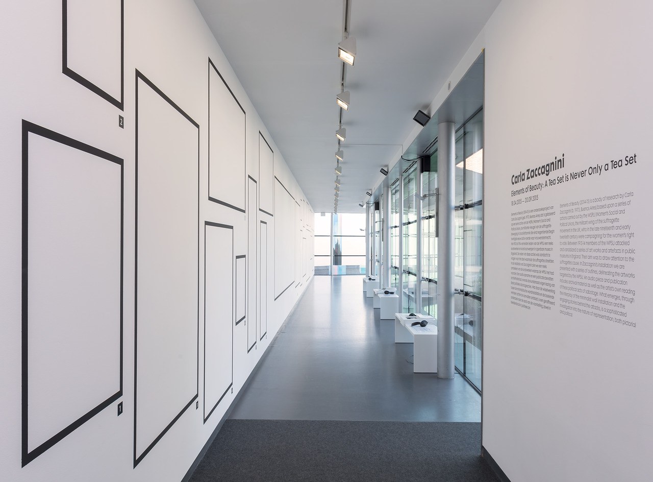 Elements of Beauty is een onderzoeksproject van Carla Zaccagnini (Buenos Aires 1973) naar een serie acties van de WPSU (Women's Social and Political Union), de militante vleugel van de suffragette beweging in Engeland. In de late 19e en vroege 20e eeuw streed deze groep voor stemrecht voor vrouwen. Vanaf 1913-1914 beschadigden leden van de WPSU kunstwerken in musea in Engeland, waaronder de Rockeby Venus van Velasquez in de National Gallery in Londen. Hiermee wilden ze aandacht vragen voor hun zaak. In Zaccagnini's installatie representeren zwarte kaders de kunstwerken die doelwit waren van de WPSU. Een audiofragment en een publicatie geven achtergrondinformatie, zoals krantenartikelen en statistieken over de acties van de suffragettes. Daarnaast geeft de kunstenares haar eigen visie op deze politieke sabotage-acties. Door de wisselwerking van de minimalistische installatie en de innemende verhalen in de audiofragmenten en het archiefmateriaal ontstaat er een subtiel onderzoek naar de aspecten van representatie, zowel in politieke als beeldende zin