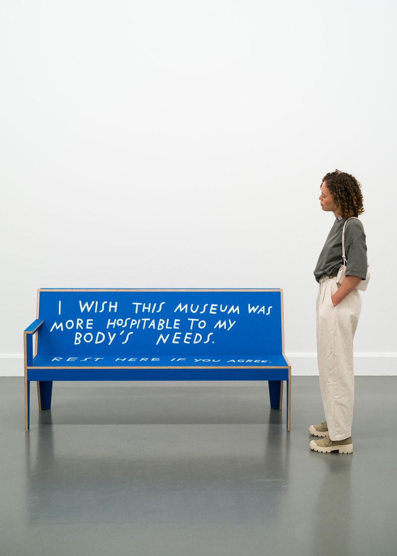 The space between us strekt zich uit over de tien zalen van de Oudbouw. Hier komen werken van kunstenaars en ontwerpers uit de museumcollectie samen met bruiklenen, onder andere van alumni van Design Academy Eindhoven. Het startpunt van de tentoonstelling is relational design. Deze vorm van ontwerp onderzoekt de invloed van voorwerpen en hun ontwerpprocessen. Zo bevraagt Finnegan Shannon de toegankelijkheid van musea. Deze maker plaatst houten bankjes in de tentoonstelling die juist waar je juist wél op mag zitten. Op de bankjes staan teksten als ‘This exhibition has asked me to stand for too long. Sit if you agree’ en nodigt bezoekers uit die, om welke reden dan ook, even willen rusten.